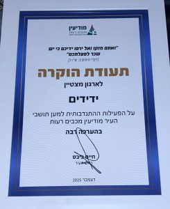 סיפק רגע מרגש במיוחד עבור משפחת 'ידידים' העירונית. סניף מודיעין של הארגון, המוכר באפודים הצהובים הבולטים שלו, קטף את המקום הראשון וזכה בתואר ארגון המתנדבים המצטיין לשנת 2025 מטעם עיריית מודיעין.