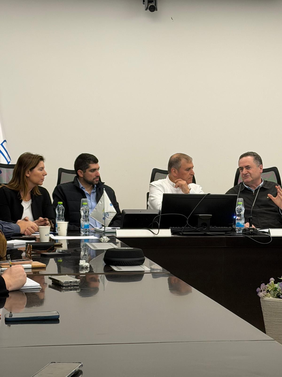 שר הביטחון ישראל כ"ץ עם שמעון סוסן ודפנה רבינוביץ במהלך הדיון המיוחד במועצה האזורית חבל מודיעין. צילום: דוברות חבל מודיעין.